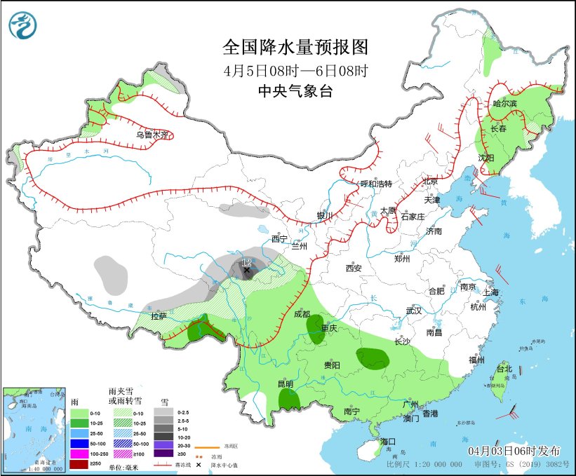 4月3日至5日,青藏高原东部、内蒙古东部、黑龙江西北部、长白山区、新疆北部高海拔地区等地部分地方有小到中雪或雨夹雪,其中,西藏东部、川西高原北部等地局地有大到暴雪。此外,西藏东南部、西南地区东部、江南中西部、华南大部、台湾岛等地部分地区有小到中雨。