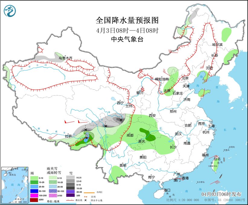 4月3日08时至4日08时,新疆沿天山一带和南疆西部山区、内蒙古东北部、西藏东部、青海东南部、川西高原北部等地部分地区有小到中雪或雨夹雪,其中,西藏东北部、川西高原北部等地部分地区有大雪(5~9毫米)。吉林东部、辽东半岛、山东半岛、山西中北部、西藏东南部、甘肃南部、陕西南部、西南地区东部、江南西部、云南南部、台湾岛等地部分地区有小到中雨,其中,西藏东南部部分地区有大雨(25~40毫米)。内蒙古中西部、西藏中北部、辽东半岛、山东半岛等地部分地区有4~6级风,其中,西藏北部部分地区有7~8级风。