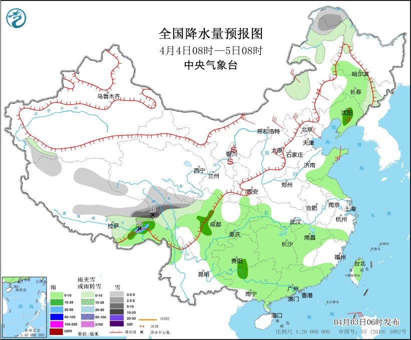 4月4日08时至5日08时,内蒙古东北部、黑龙江西北部、吉林东部、西藏东北部、青海南部、川西高原北部等地部分地区有小到中雪或雨夹雪,其中,西藏东北部、川西高原北部等地部分地区有大雪,局地暴雪(10~13毫米)。吉林中西部、辽宁大部、西藏东南部、西南地区东部、黄淮东部、江汉西部、江南大部、华南大部、台湾岛等地部分地区有小到中雨,其中,西藏东南部部分地区有大雨(25~35毫米)。内蒙古中东部、河北北部、辽宁东部、山东半岛等地部分地区有4~6级风。