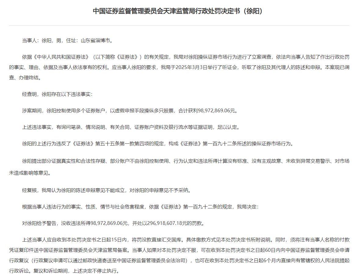 财联社4月2日讯,近日,天津证监局公布了一则行政处罚决定书,对股民徐阳操纵证券市场的违法行为作出严厉处罚,合计罚没金额近4亿元。