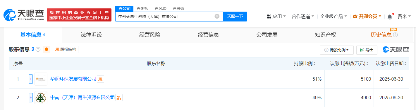 天眼查App显示,近日,中资环再生资源(天津)有限公司成立,法定代表人为黄华,注册资本1亿人民币,经营范围包括再生资源加工、再生资源回收、再生资源销售、非金属废料和碎屑加工处理、供应链管理服务、国内贸易代理等,由华润环保发展有限公司、中南(天津)再生资源有限公司共同持股。