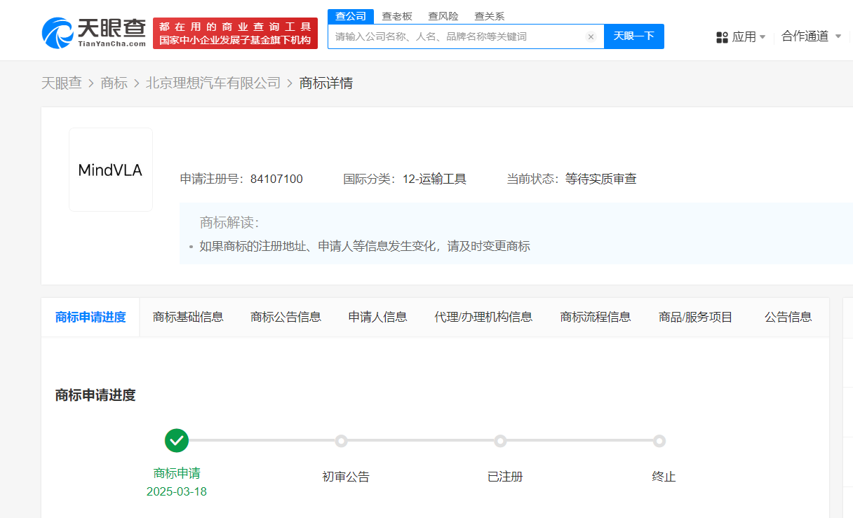 天眼查财产线索信息显示,近日,北京理想汽车有限公司申请注册“MindVLA”商标,国际分类为运输工具,当前商标状态为等待实质审查。
