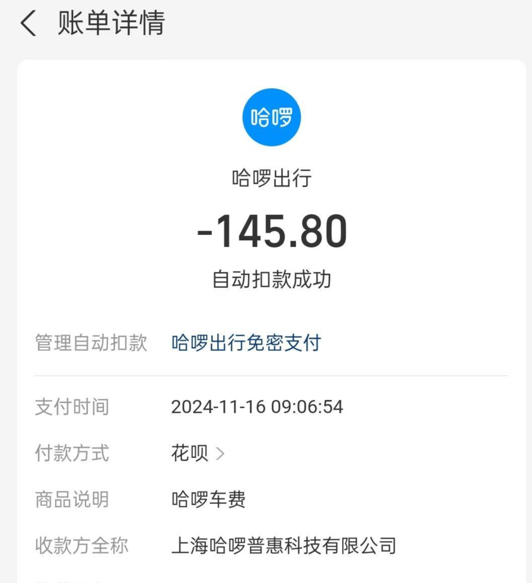 根据韩先生提供的订单截图显示,这笔顺风车订单支付时间为11月16日当天上午9点,总支付费用为145.8元。韩先生回忆,在看到司机接单之后,他特地向对方说明是运送三只小马犬,之后司机同意将狗拉走。但是在车辆行进途中,韩先生接到司机电话要求加钱,原因是狗吐在车上了。“我说加钱就加钱呗,适当加一点我也可以接受,但是得走哈啰顺风车的平台,司机不同意并要求私下支付。”