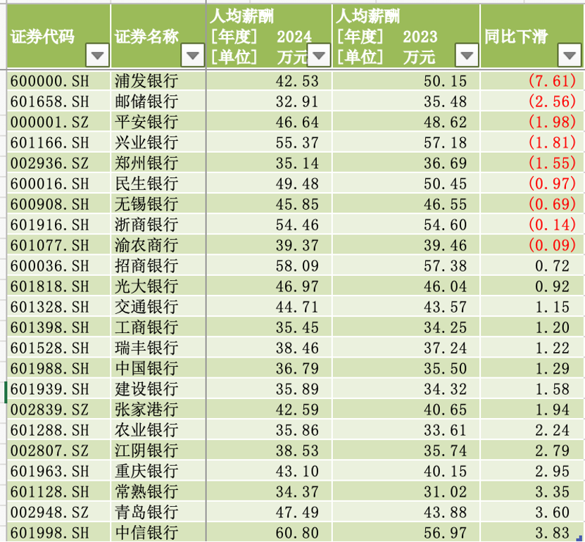 9家银行2024年人均薪酬下滑