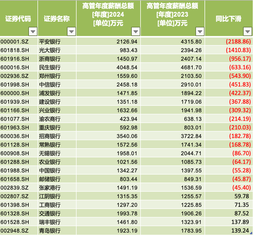 其中,2024年不少银行的高管薪酬总额出现了较大幅度的下滑。如平安银行高管薪酬总额为2126.94万元,相较上一年下滑2188.86万元,相当于“腰斩”;光大银行的高管薪酬总额也同比下滑1410.83万元;此外,有5家银行高管薪酬总额下滑超400万元。