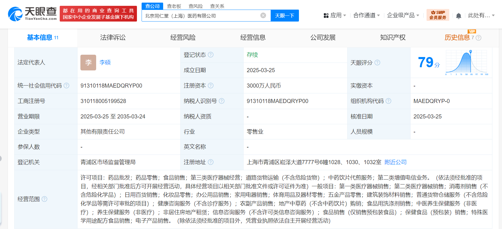 天眼查App显示,近日,北京同仁堂(上海)医药有限公司成立,法定代表人为李硕,注册资本3000万人民币,经营范围含药品批发、药品零售、食品销售、中药饮片代煎服务、消毒剂销售、日用百货销售、化妆品零售、办公用品销售等。股东信息显示,该公司由同仁堂(600085)旗下北京同仁堂商业投资集团有限公司以及九州通(600998)旗下上海好药师大药房连锁有限公司分别持股51%、49%。