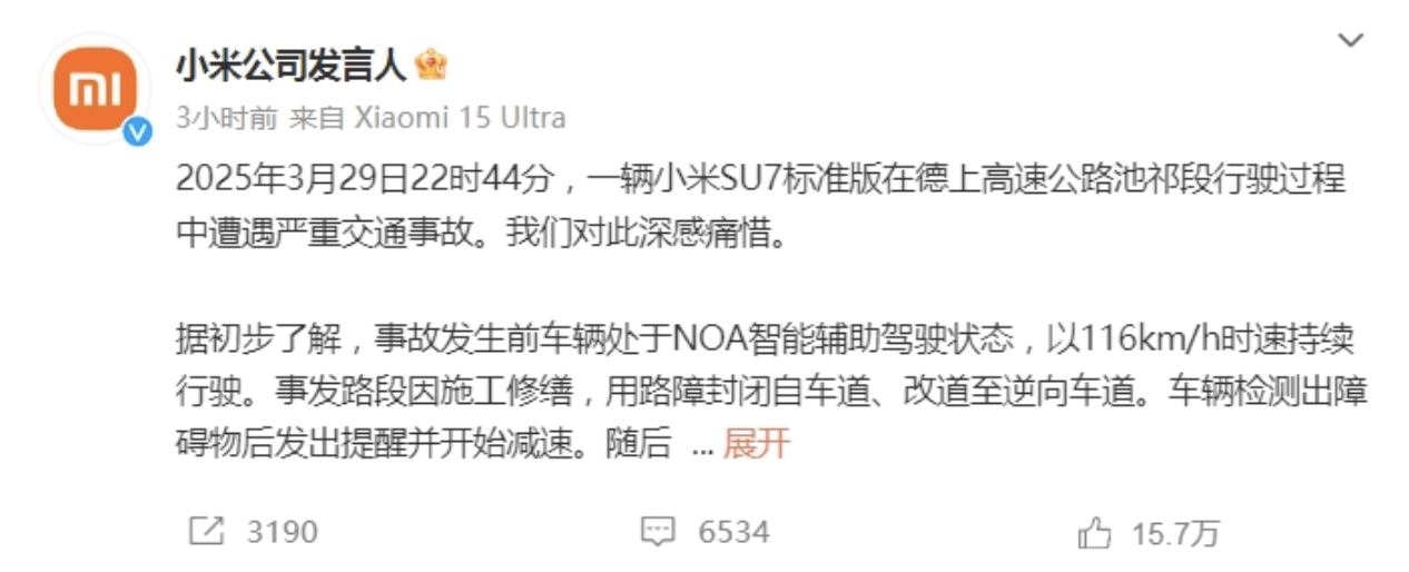 “小米公司发言人”微博提到,2025年3月29日22时44分,一辆小米SU7标准版在德上高速公路池祁段行驶过程中遭遇严重交通事故。据初步了解,事故发生前车辆处于NOA智能辅助驾驶状态,以116km/h时速持续行驶。事发路段因施工修缮,用路障封闭自车道、改道至逆向车道。车辆检测出障碍物后发出提醒并开始减速。随后驾驶员接管车辆进入人驾状态,持续减速并操控车辆转向,随后车辆与隔离带水泥桩发生碰撞,碰撞前系统最后可以确认的时速约为97km/h。