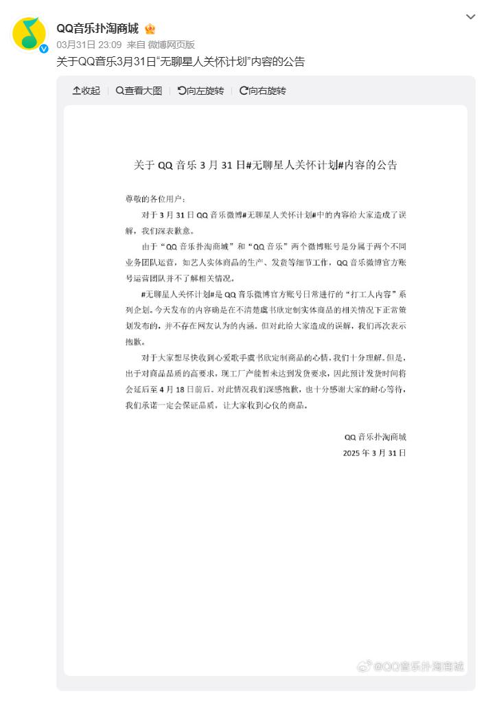 3月31日晚,@QQ音乐扑淘商城 对此发文回应,称“艺人实体商品的生产、发货等细节工作,QQ音乐微博官方账号运营团体并不了解相关情况”,称不存在网友认为的内涵,抱歉给大家造成误解。