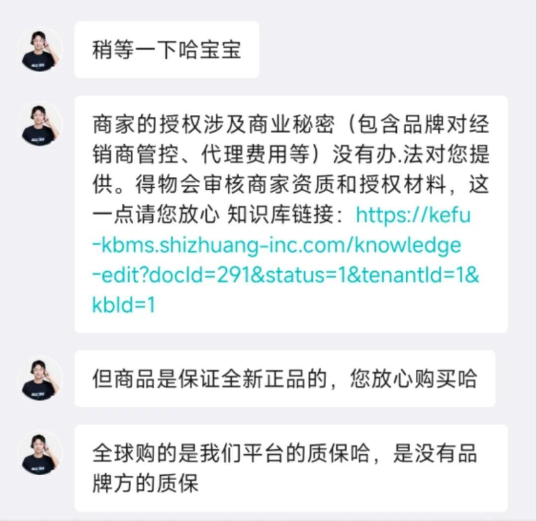得物客服称商家的授权涉及商业秘密。图源 | 得物APP截图