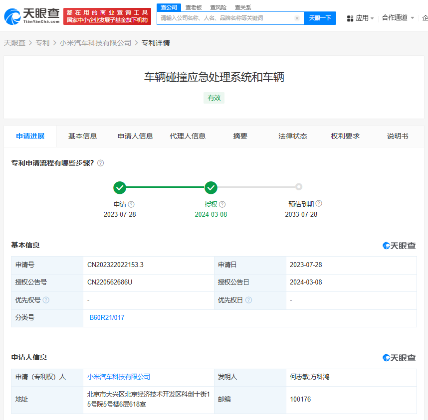 天眼查知识产权信息显示,小米汽车科技有限公司已申请多个自动驾驶、安全相关专利,包括“车辆的警示方法、装置及车辆”“车辆自动紧急呼叫方法、装置、车辆”等。