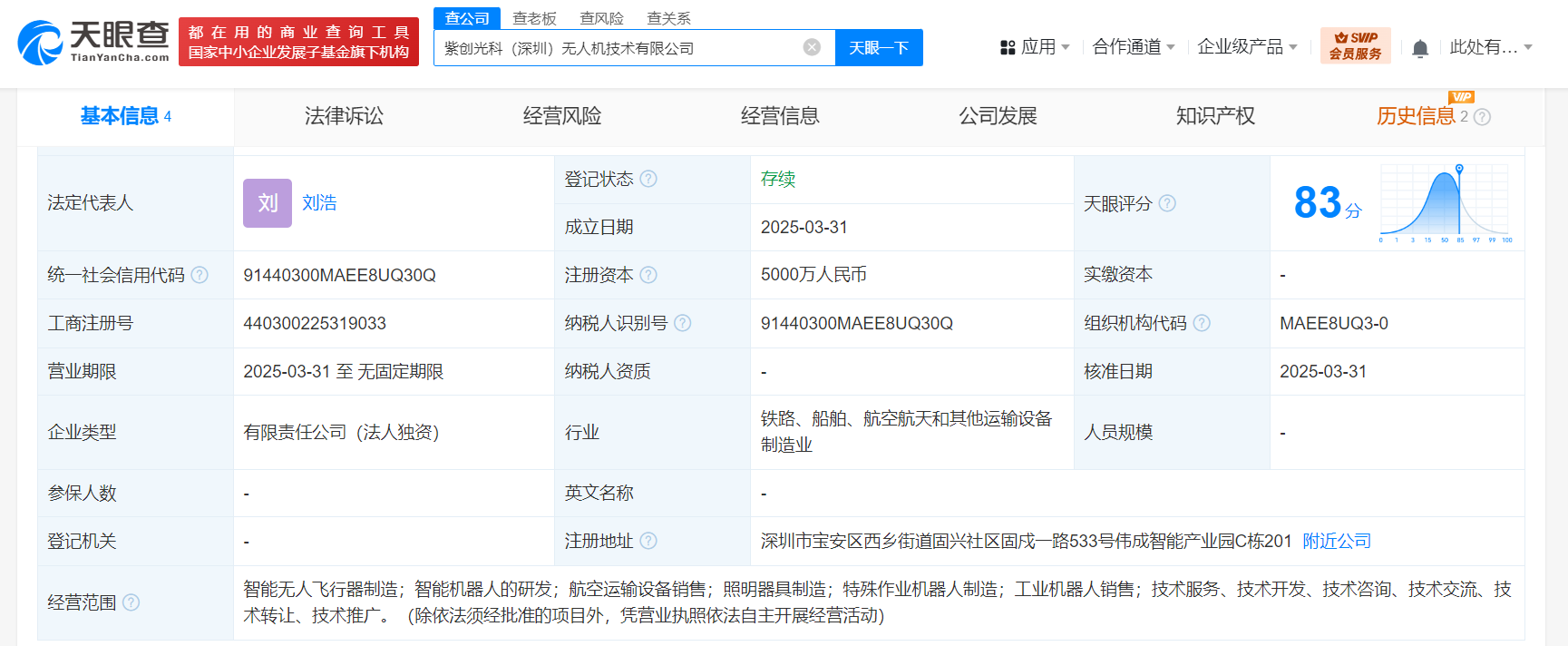 天眼查App显示,近日,紫创光科(深圳)无人机技术有限公司成立,法定代表人为刘浩,注册资本5000万人民币,经营范围含智能无人飞行器制造、智能机器人的研发、航空运输设备销售、照明器具制造、特殊作业机器人制造、工业机器人销售等。股东信息显示,该公司由深圳市紫光照明技术股份有限公司全资持股。
