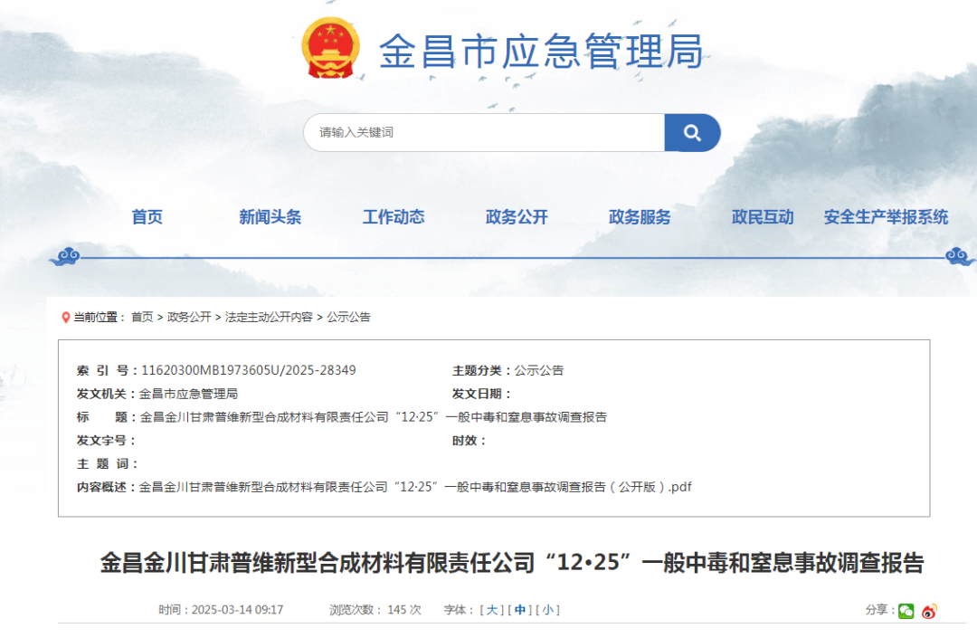据应急管理部消息,2024年12月25日20时46分许,甘肃普维新型合成材料有限责任公司作业人员在进行检维修作业时,发生一起窒息事故,造成2人死亡,直接经济损失62万元。近日,甘肃金昌市应急管理局公布了该起事故调查报告。