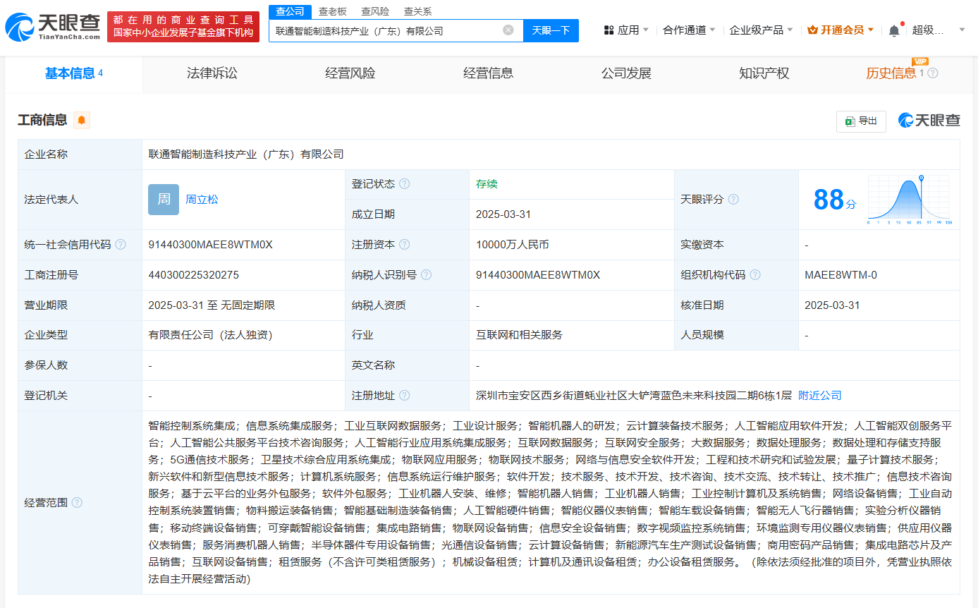 天眼查App显示,近日,联通智能制造科技产业(广东)有限公司成立,法定代表人为周立松,注册资本1亿人民币,经营范围包括智能机器人的研发、云计算装备技术服务、人工智能应用软件开发、人工智能双创服务平台、人工智能行业应用系统集成服务等。股东信息显示,该公司由联通数字科技有限公司全资持股。