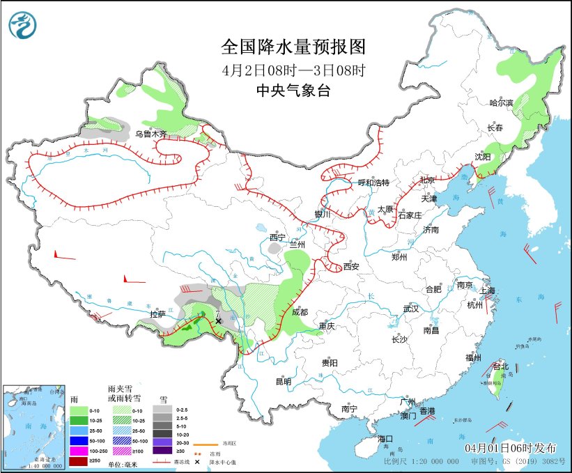 4月1日08时至2日08时,新疆沿天山地区和伊犁河谷高海拔地区、青海南部、西藏东部、川西高原、内蒙古东部、河北北部、黑龙江中部、吉林中东部等地部分地区有小雪或雨夹雪,其中,新疆伊犁河谷高海拔地区、西藏东北部、青海东南部、川西高原北部等地部分地区有中到大雪,西藏东北部、川西高原北部等地局地有暴雪(10~13毫米)。新疆北疆北部、西藏东南部、四川盆地西部和中部、重庆南部、贵州西部、云南南部和东北部、内蒙古东部、辽宁南部和东部、吉林西部、黑龙江中部和东北部、海南岛南部、台湾岛等地部分地区有小到中雨。内蒙古中部、辽东半岛、河北北部、西藏中南部等地部分地区有5~6级风,其中,西藏中部部分地区有7~8级风;渤海、渤海海峡、黄海西部、东海、台湾海峡、台湾以东洋面、巴士海峡、南海中北部等海域有6~7级风,阵风8~9级。