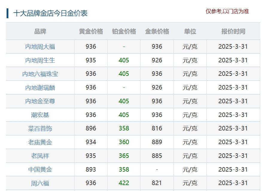 黄金珠宝品牌的首饰金价格也水涨船高。3月31日,多家国内黄金珠宝品牌的金饰价格均突破935元/克。当日,周大福足金、六福珠宝足金999/足金、潮宏基足金、谢瑞麟足金饰品、周六福足金饰品的境内价格达936元/克;周生生、老凤祥足金饰品境内价格为935元/克;老庙黄金上海区域足金饰品价格为934元/克。