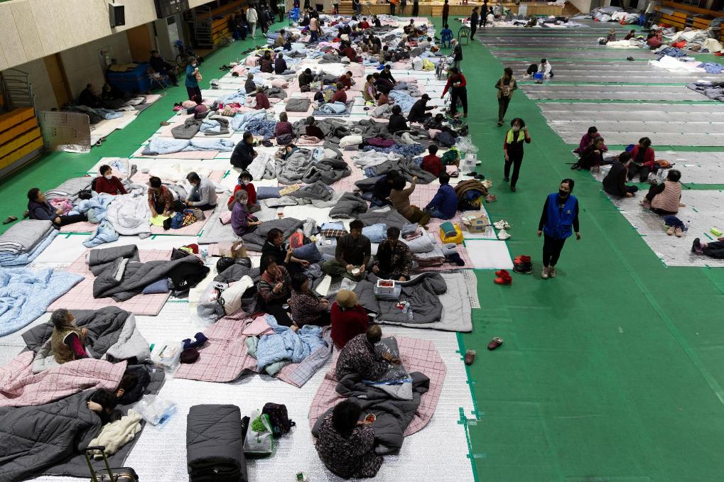 3月27日晚,受灾群众在韩国庆尚北道英阳郡一处避难所过夜。新华社发(全休相摄)