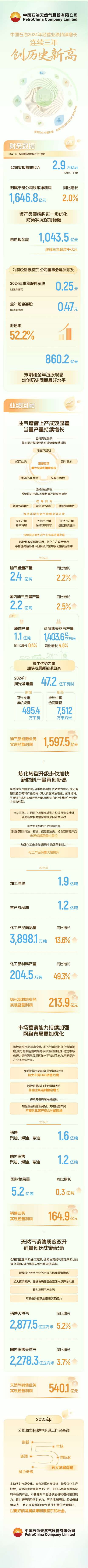 3月30日,中国石油发布2024年度业绩报告, 2024年, 公司积极应对形势变化,持续加大勘探开发力度,深入推进炼化转型升级,不断提升市场营销质量,着力实施提质增效行动,扎实推进绿色低碳转型,加快布局新兴产业,大力提高ESG工作质效,油气两大产业链创效能力进一步增强,在实现油价同比下降2.5%的情况下,公司经营业绩保持增长,连续三年创历史新高,实现营业收入2.9万亿元,归属于母公司股东净利润1646.8亿元,同比增长2.0%。