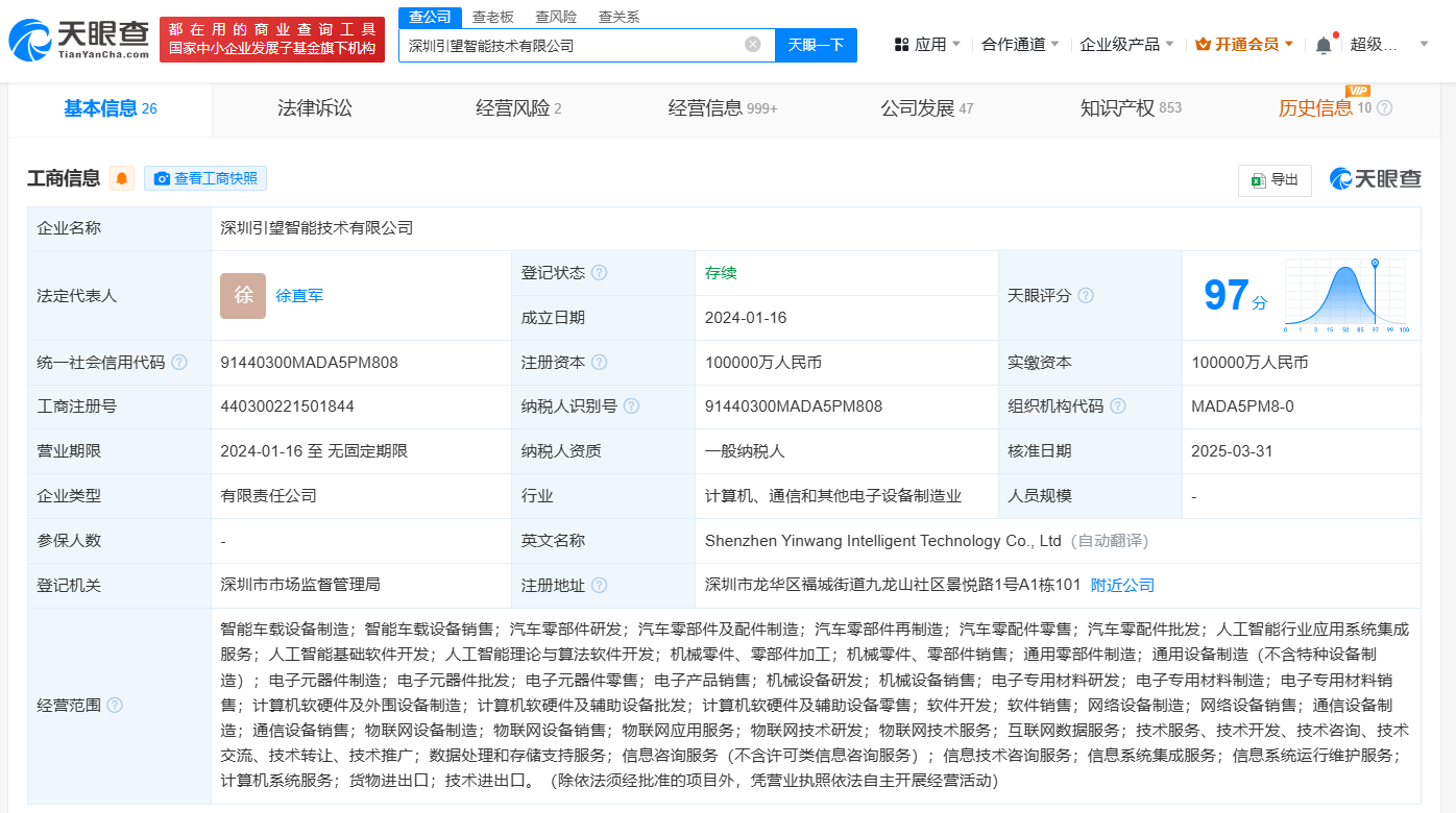 天眼查App显示,近日,深圳引望智能技术有限公司发生工商变更,股东新增赛力斯汽车有限公司、阿维塔科技(重庆)有限公司;新增徐直军任法定代表人、董事长,余承东任副董事长,同时多位主要人员发生变更。
