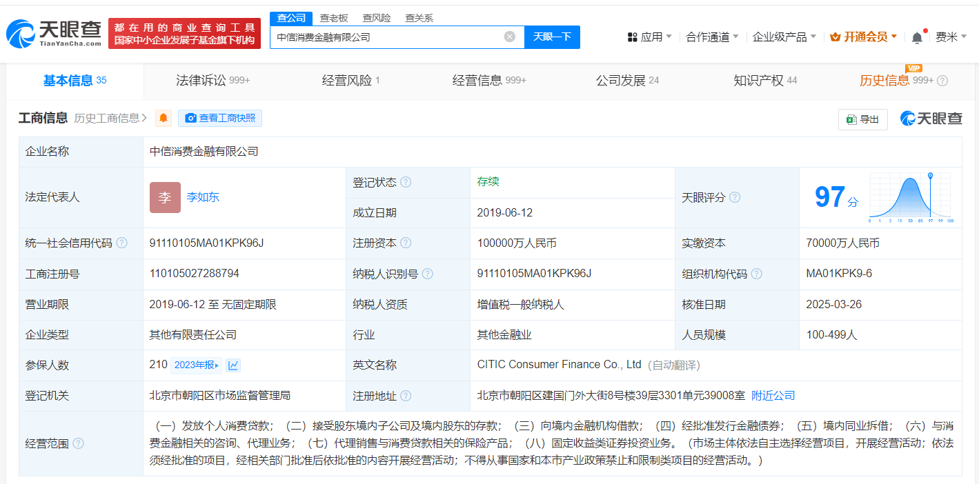 该公司成立于2019年6月,法定代表人为李如东,经营范围包括发放个人消费贷款、接受股东境内子公司及境内股东的存款、向境内金融机构借款等,由中国中信金融控股有限公司、金蝶软件(中国)有限公司共同持股。