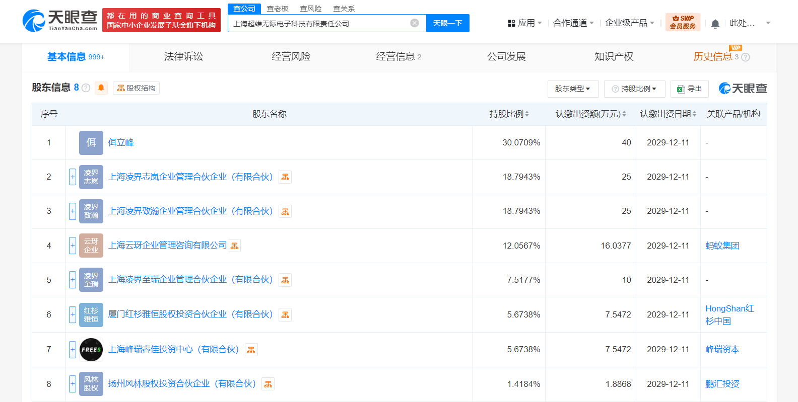 上海超维无际电子科技有限责任公司成立于2024年12月,法定代表人为佴立峰,经营范围含人工智能基础软件开发、人工智能理论与算法软件开发、人工智能应用软件开发、软件销售、计算机软硬件及辅助设备零售、网络与信息安全软件开发等。股东信息显示,该公司现由佴立峰、上海凌界志岚企业管理合伙企业(有限合伙)、上海凌界致瀚企业管理合伙企业(有限合伙)及上述新增股东等共同持股。公开信息显示,该公司是一家人工智能基础软件开发商。