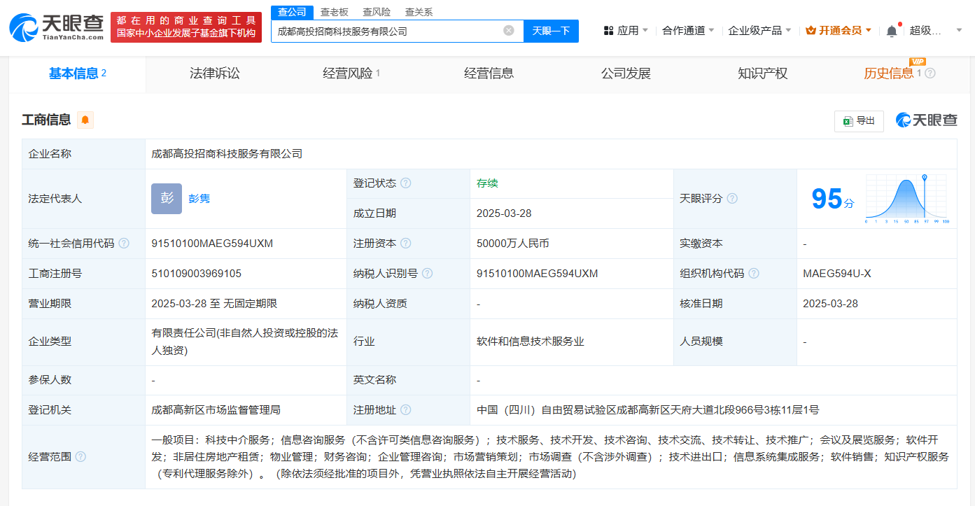 天眼查App显示,近日,成都高投招商科技服务有限公司成立,法定代表人为彭隽,注册资本5亿人民币,经营范围包括科技中介服务、物业管理、财务咨询、企业管理咨询、市场营销策划等。股东信息显示,该公司由成都高新投资集团有限公司全资持股。
