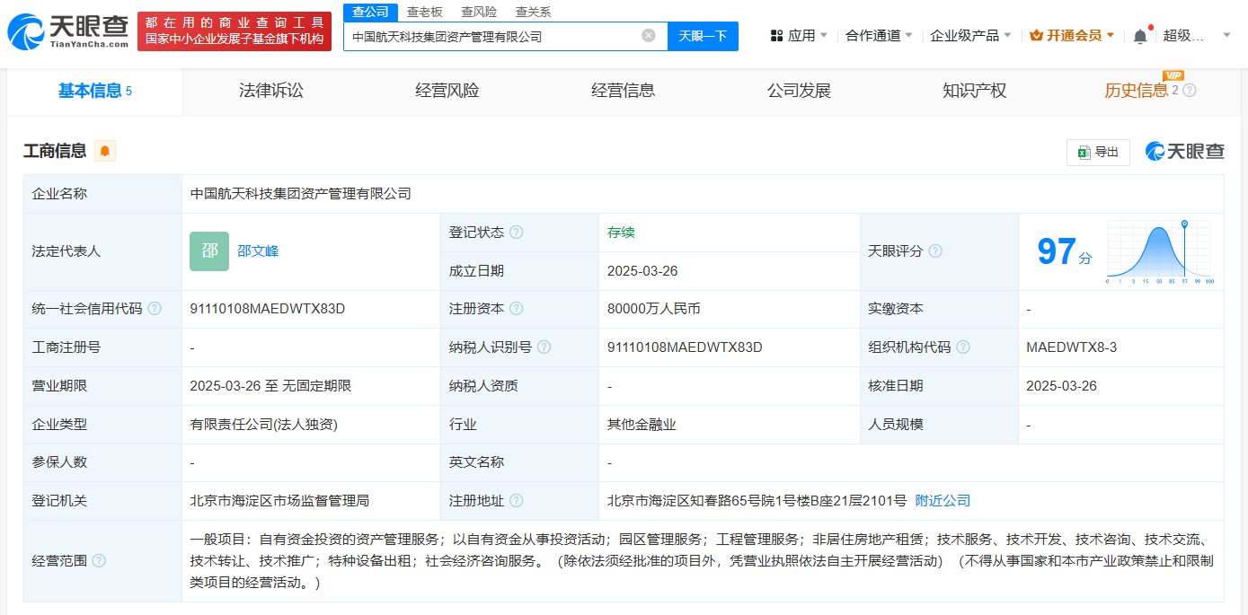 天眼查App显示,近日,中国航天科技集团资产管理有限公司成立,法定代表人为邵文峰,注册资本8亿人民币,经营范围包括自有资金投资的资产管理服务、以自有资金从事投资活动、园区管理服务、工程管理服务等。股东信息显示,该公司由中国航天科技集团有限公司全资持股。