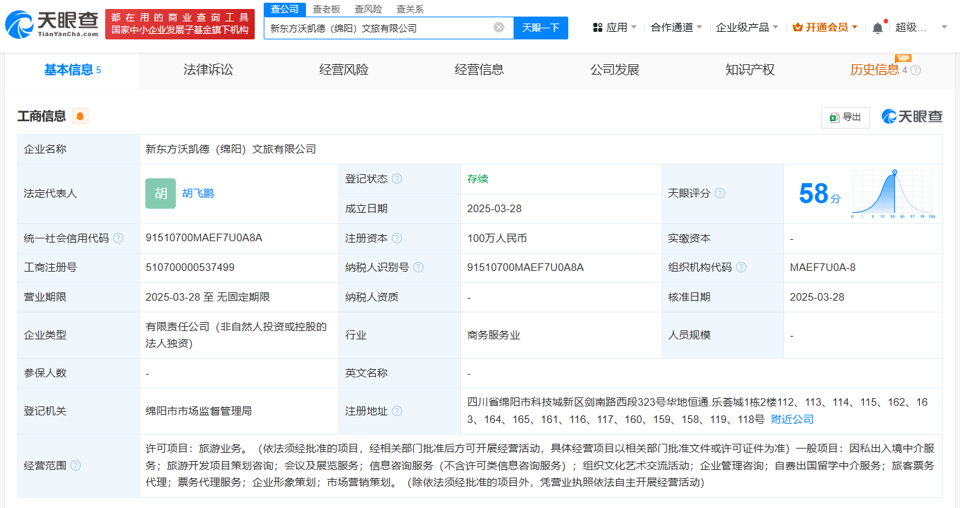 天眼查App显示,近日,新东方沃凯德(绵阳)文旅有限公司成立,法定代表人为胡飞鹏,注册资本100万人民币,经营范围包括旅游业务、因私出入境中介服务、旅游开发项目策划咨询等。股权全景穿透图显示,该公司由北京新东方沃凯德国际教育旅行有限公司全资持股,后者为北京新东方文旅有限公司全资子公司。