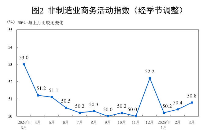 3月份,非制造业商务活动指数为50.8%,比上月上升0.4个百分点,非制造业扩张步伐有所加快。