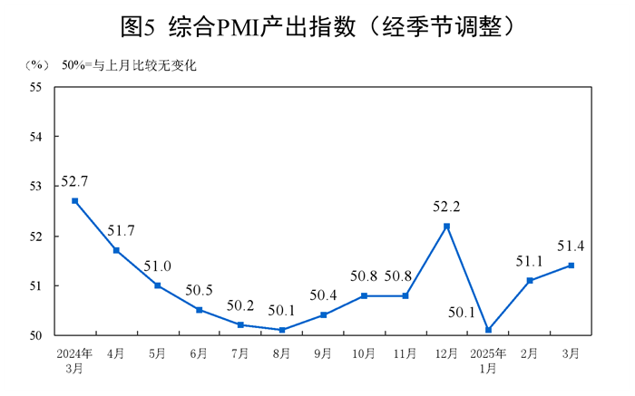 3月份,综合PMI产出指数为51.4%,比上月上升0.3个百分点,表明我国企业生产经营活动总体扩张加快。