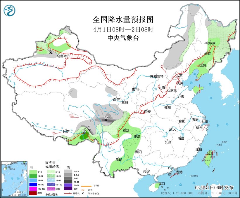 4月1日08时至2日08时,内蒙古东部、黑龙江中东部、吉林东部、辽宁东北部、新疆西北部山区、西藏东部、青海南部、川西高原北部等地部分地区有小到中雪或雨夹雪,其中,新疆沿天山地区、西藏东部、川西高原北部等地部分地区有大雪,局地暴雪(10~16毫米)。新疆伊犁河谷和北疆盆地、西藏东南部、吉林中部、辽宁大部、山东半岛、西南地区东部和南部、海南岛东部、台湾岛等地部分地区有小到中雨,其中,西藏东南部等地局部地区有大雨(25~40毫米)。西藏南部、内蒙古中部、辽宁中南部、河北中南部、天津、山西、山东半岛、浙江东部等地部分地区有4~6级风,西藏东部部分地区有6~7级风;渤海、渤海海峡、黄海西部、东海南部、台湾海峡、台湾以东洋面、巴士海峡、南海中北部海域有6~7级风,阵风8级。