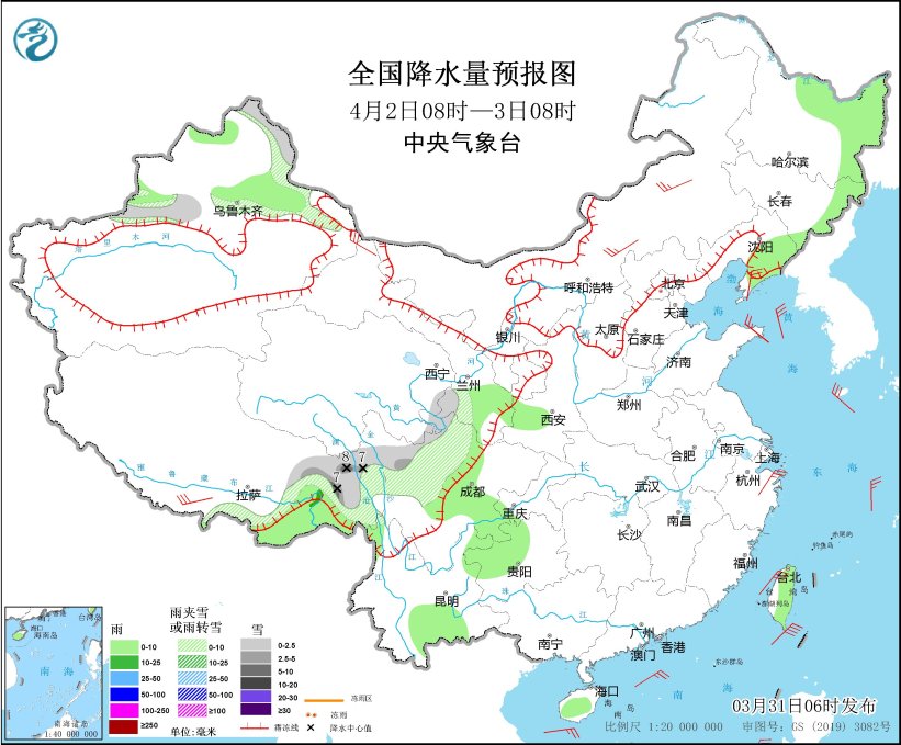 4月2日08时至3日08时,新疆阿勒泰高海拔地区和沿天山地区、西藏东部、甘肃西南部、川西高原北部等地部分地区有小到中雪或雨夹雪,其中,西藏东部等地部分地区大雪(5~8毫米)。东北地区东部、新疆北疆盆地、西藏东南部、甘肃南部、四川盆地南部、贵州西北部、云南南部、海南岛中西部、台湾岛东部等地部分地区有小到中雨。内蒙古中东部、辽东半岛、山东半岛、浙江东部、西藏南部等地部分地区有4~6级风;东海南部、台湾海峡、台湾以东洋面、巴士海峡、南海中北部海域有6~7级风,阵风8级。