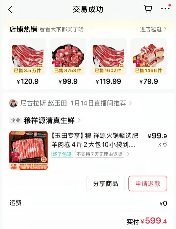 据相关直播视频显示,“赵玉田”在直播中称:“这个级别的羊肉卷,你在外面买不着,外面基本都是拼接的羊肉卷,跟我这个鲜羊肉卷不是一个级别。”