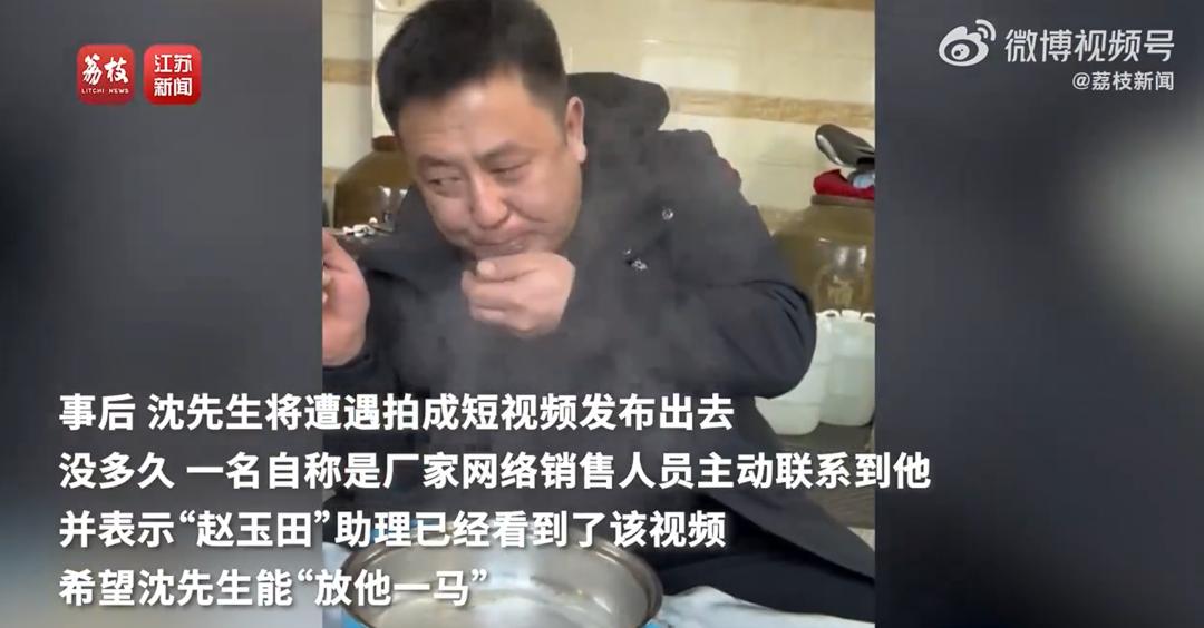 据媒体报道,沈先生将遭遇拍成短视频发布后,有自称是厂家网络销售人员主动联系他,并表示“赵玉田”助理已经看到了该视频,希望沈先生能“放他一马”,并说老弟这边那点钱,你把视频删一下吧。