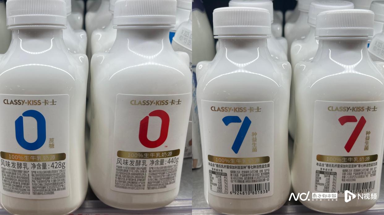 南都湾财社记者走访线下超市发现情况确实如此,卡士007系列酸奶有多种款式,一种是红色字样,一种是蓝色字样,但设计风格相似,均为包装一侧中央印有大字号“0”,另一侧中央印有“7”,其中企业解释“7”为“7种益生菌”的意思。