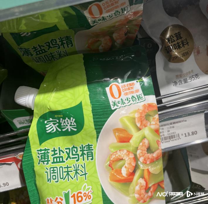 对比来看,一些品牌会直接在包装正面的“零添加”宣传用语旁标注对应的成分。如联合利华旗下的家乐品牌鸡精调味料标注“0反式脂肪,0防腐剂(防腐剂指苯甲酸钠和山梨酸钾);松鲜鲜的松茸调味料标注“0添加;不含山梨酸钾、苯甲酸钠、三氯蔗糖”。