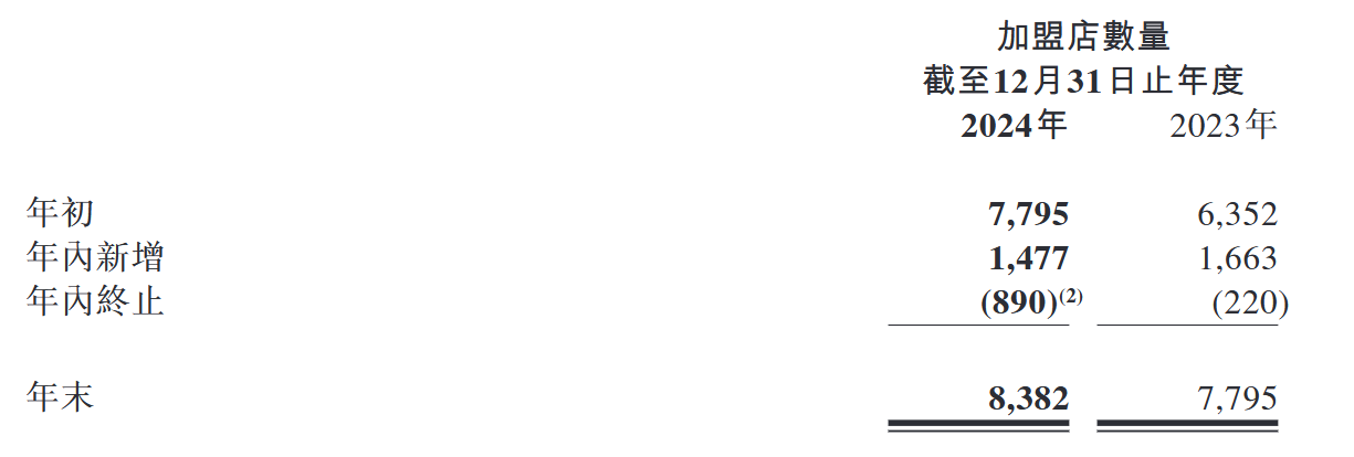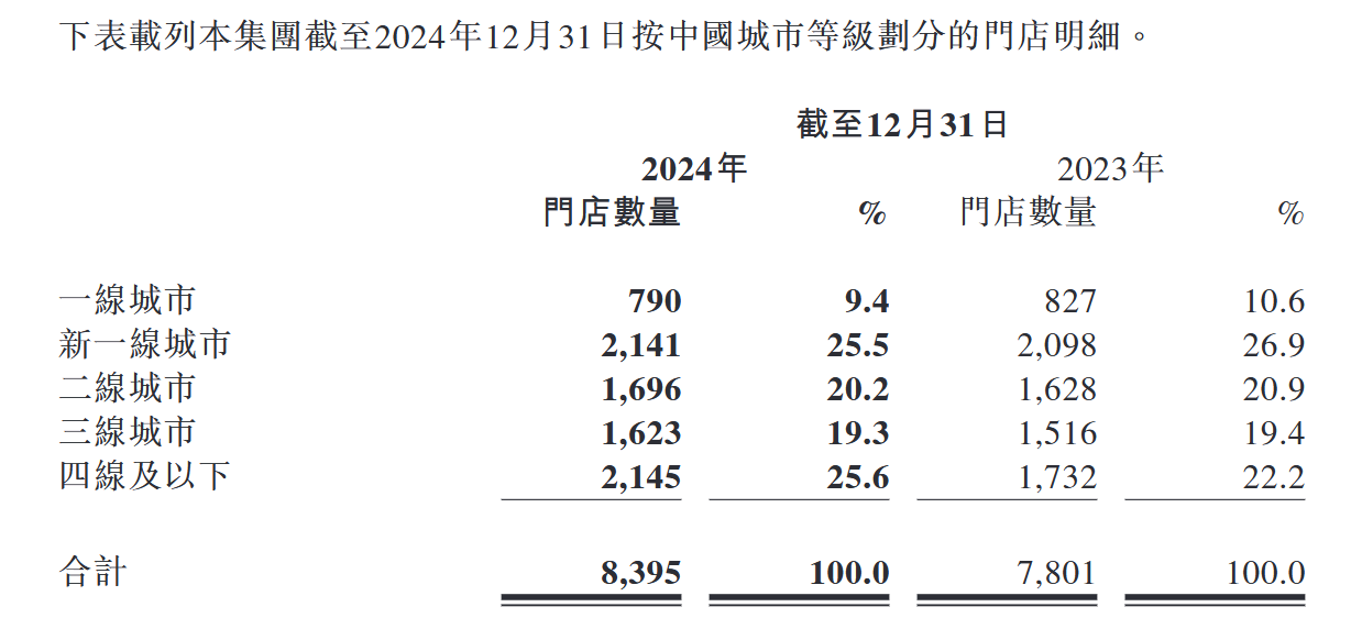 由于市场竞争加剧,公司加大了对加盟商的政策支持及市场营销投入,导致毛利率从去年同期的34.4%下降至31.2%。2024年,公司门店数量增加至8395家,同比增长7.6%,新开店数量为1477家,关店数量为890家。不过,8395家门店当中,一线城市仅有790家,占比9.4%,较2023年的827家减少了37家。茶百道门店增长最多的是四线及以下城市,2024年门店达2145家,占比达25.6%,而2023年仅为1732家,占比22.2%。