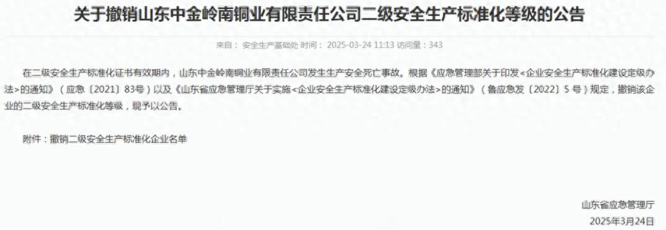 3月24日,山东省应急管理厅发布消息称,撤销山东中金岭南铜业有限责任公司二级安全生产标准化等级。
