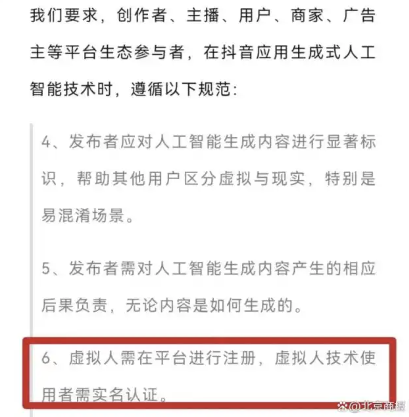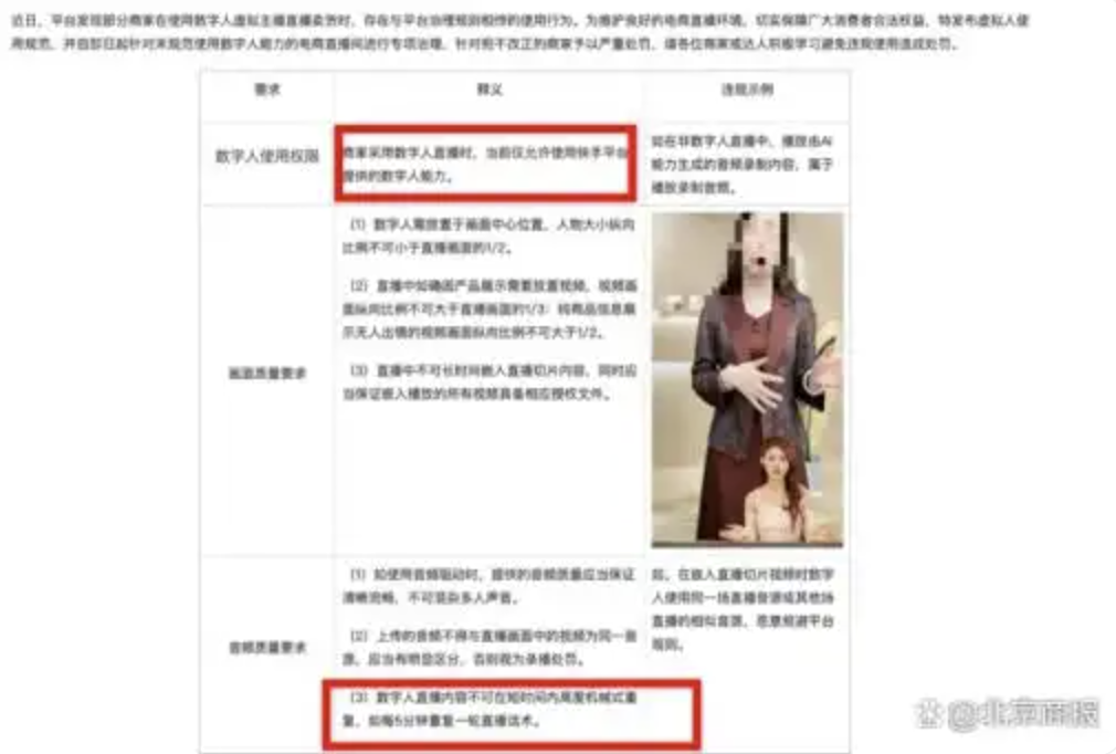如抖音规定使用虚拟人进行直播必须对相应的虚拟人形象在平台注册,直播时须由真人驱动进行实时互动,不允许完全由AI驱动进行互动,虚拟人直播必须显著标识;快手规定商家采用数字人直播时,仅允许使用快手平台提供的数字人能力,直播内容不可在短时间内高度机械重复。