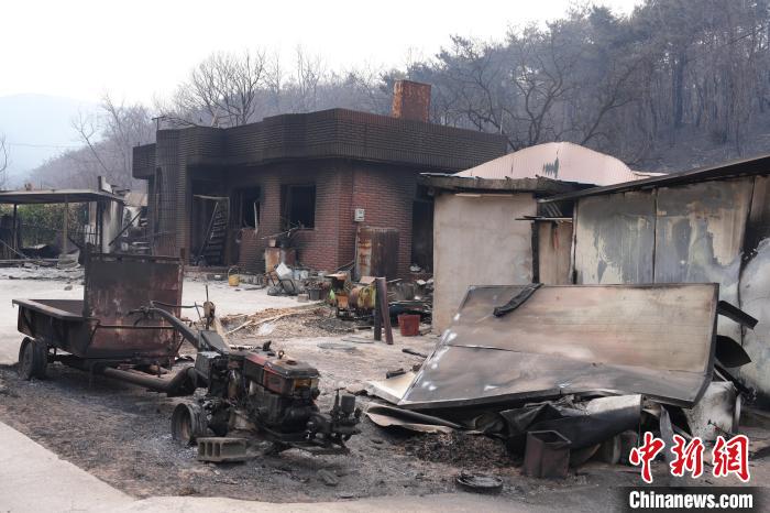 据韩国中央灾难安全对策本部3月27日消息,截至当日20时,在庆尚道等地发生的大型山火已致28人死亡、32人受伤。山林受灾面积创韩国历史最高。图为3月27日拍摄的庆尚道山火烧毁的建筑。 中新社记者 刘旭 摄