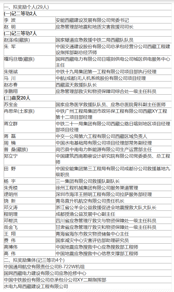 据应急管理部网站消息,2025年1月7日,西藏日喀则市定日县发生6.8级地震,造成重大人员伤亡。国务院抗震救灾指挥部办公室、应急管理部统一调派指挥国家和地方抢险救援队伍、航空救援和社会应急力量赶赴灾区抗震救灾。参加抗震救灾的各支救援力量勇挑重担、冲锋在前,克服高寒缺氧、余震不断等不利因素,在海拔4300多米的高原地区英勇拼搏、夙夜奋战,最大限度地减少了地震灾区的人员伤亡和财产损失,涌现出一批先进典型。为奖励先进、鼓舞士气,根据《应急管理系统奖励暂行规定》,应急管理部拟对抗震救灾中作出突出贡献的李波等29名同志和中国通用航空有限责任公司B-722W机组等4个集体给予奖励。