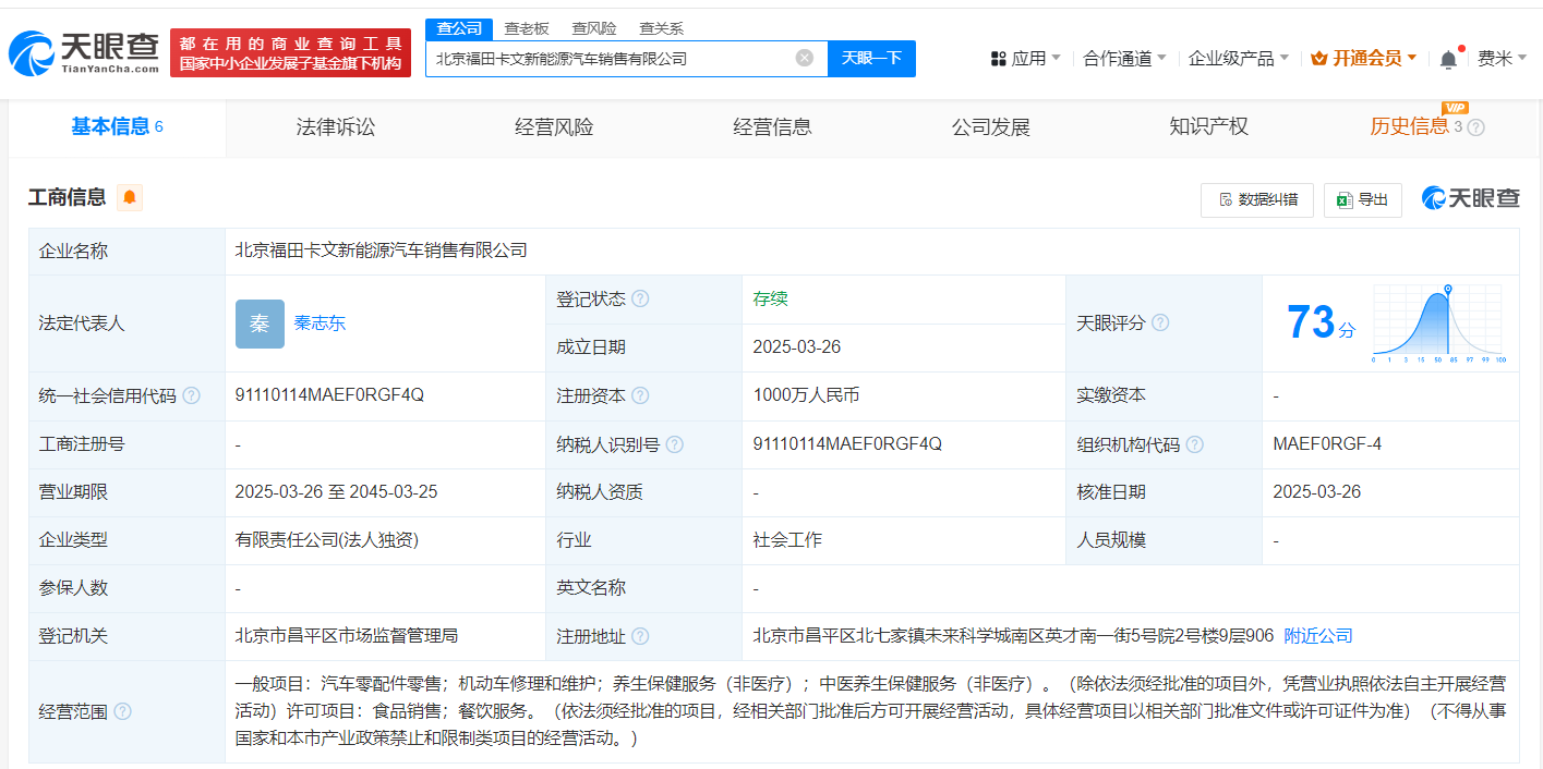 天眼查App显示,近日,北京福田卡文新能源汽车销售有限公司成立,法定代表人为秦志东,注册资本1000万人民币,经营范围包括汽车零配件零售、机动车修理和维护、食品销售、餐饮服务等。股权全景穿透图显示,该公司由福田汽车(600166)旗下北京卡文新能源汽车有限公司全资持股。