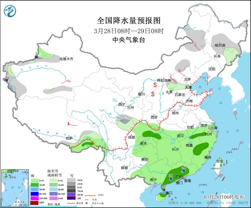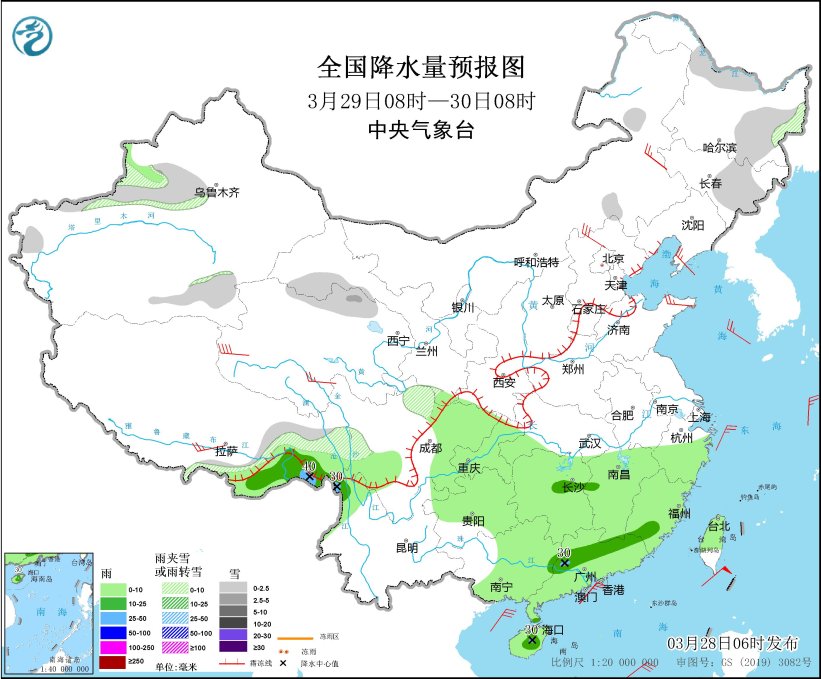 3月28日08时至29日08时,新疆伊犁河谷和南疆西部山区、内蒙古东北部、黑龙江南部、吉林中东部、甘肃南部、山西北部、西藏东部、川西高原北部等地部分地区有小到中雪或雨夹雪,局地有大雪(5~7毫米)。西藏东南部、西南地区东部、江淮西部、江汉大部、江南、华南等地部分地区有小到中雨,其中,广东西南部和中部、海南岛北部等地部分地区有大雨(25~40毫米)。新疆南疆盆地、内蒙古中东部、辽东半岛、河北北部、山东半岛、浙江北部等地部分地区有5~6级风,西藏北部部分地区有7~8级风。黄海大部海域、东海大部海域、台湾海峡、台湾以东洋面、巴士海峡、南海北部海域、北部湾将有7~8级、阵风9~10级的大风。