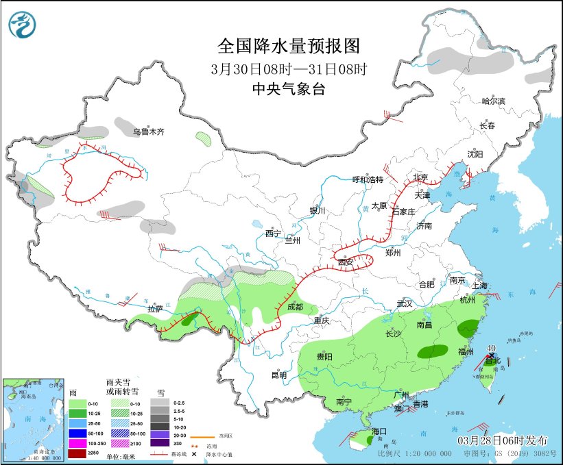 3月30日08时至31日08时,新疆伊犁河谷和南疆山区、内蒙古东北部、黑龙江北部、青海南部、西藏东北部、川西高原北部等地部分地区有小到中雪或雨夹雪。西藏东部、西南地区北部和东南部、江南大部、华南、台湾岛等地部分地区有小到中雨,局地有大雨(25~40毫米)。新疆南疆盆地、内蒙古中东部、辽东半岛、青海西部、华北北部、西藏南部等地部分地区有5~6级风,局地阵风风力可达7级及以上(见图5)。