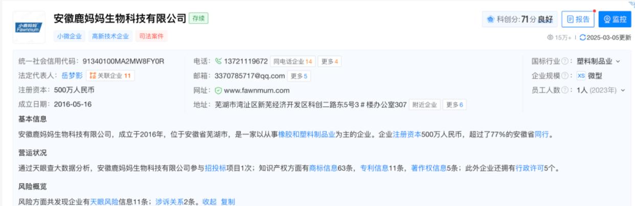 天眼查App显示,安徽鹿妈妈生物科技有限公司法定代表人为岳梦影,注册资本500万人民币,经营范围包括生物科技产品的研发、生产、销售等,由夏泉、芦士琴分别持股90%、10%。