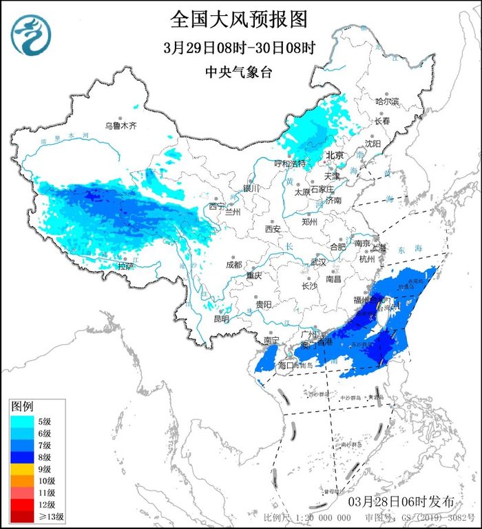 3月29日08时至30日08时,新疆南疆、西藏中北部、青海西部、甘肃河西、内蒙古中东部、华北北部等地的部分地区有5~6级风,阵风可达7级及以上;东海南部海域、台湾海峡、台湾以东洋面、巴士海峡、南海北部海域、北部湾将有7~8级、阵风9级的大风,其中台湾海峡部分海域风力可达9级、阵风10级。