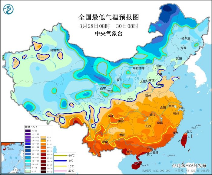 受寒潮影响,预计,3月28日08时至3月30日08时,新疆南疆盆地西部、西北地区东部、内蒙古东北部、吉林东部、辽宁中南部、华北、黄淮、江淮、江汉、江南、华南大部以及四川东北部、重庆东北部、贵州东部等地将先后降温8~10℃,其中,华北西部、黄淮、江淮、江汉、江南、华南北部、贵州东部等地部分地区降温可达12~16℃,局地降温超过18℃。过程最低气温将出现在3月29日夜间至30日凌晨,最低温度0℃线将位于华北南部至秦岭一带。