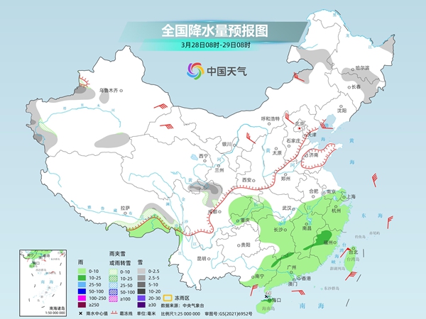后天,新疆沿天山地区和伊犁河谷、西藏东南部、青海北部、甘肃河西、川西高原北部等地部分地区有小到中雪或雨夹雪,其中,西藏东南部局地有大雪。西藏东南部、湖南中部、江西中北部和南部、浙江中南部、福建西北部等地部分地区有中雨。