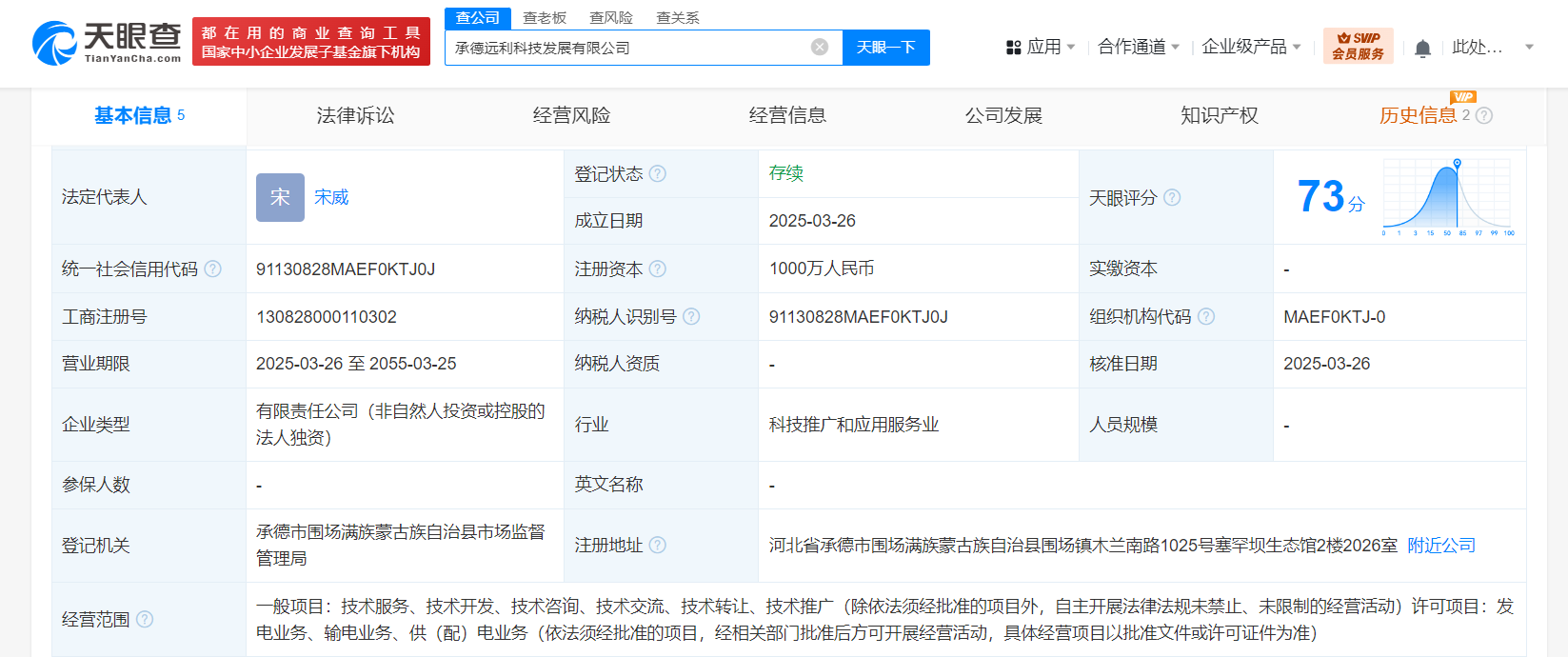 天眼查App显示,近日,承德远利科技发展有限公司成立,法定代表人为宋威,注册资本1000万人民币,经营范围为技术服务、技术开发、技术咨询、技术交流、技术转让、技术推广,发电业务、输电业务、供(配)电业务。股东信息显示,该公司由国投电力(600886)全资持股。