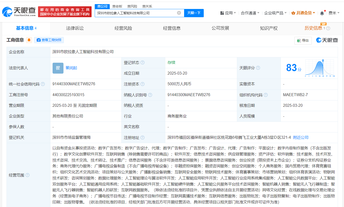 天眼查App显示,近日,深圳市欧拉象人工智能科技有限公司成立,法定代表人为翟间起,注册资本5000万人民币,经营范围包括以自有资金从事投资活动、数字广告发布、人工智能理论与算法软件开发、人工智能应用软件开发、人工智能行业应用系统集成服务、人工智能公共数据平台等,由深圳红杉汇投资合伙企业(有限合伙)全资持股。后者股东为中央汇金投资有限责任公司、深圳中汇天启投资合伙企业(有限合伙)。