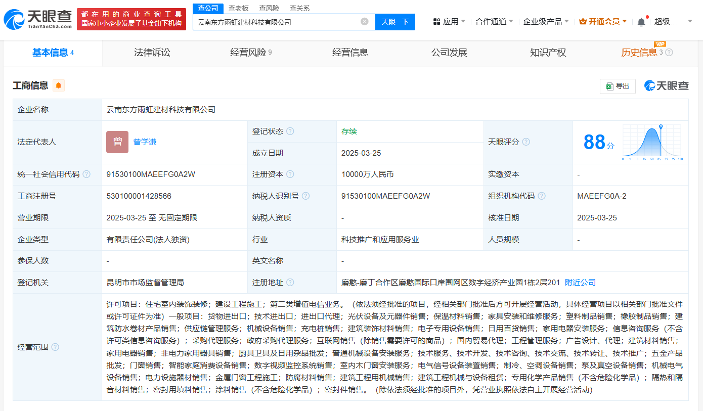 天眼查App显示,近日,云南东方雨虹建材科技有限公司成立,法定代表人为曾学谦,注册资本1亿人民币,经营范围包括建筑防水卷材产品销售、供应链管理服务、智能家庭消费设备销售、保温材料销售、密封用填料销售等。股东信息显示,该公司由东方雨虹(002271)全资持股。